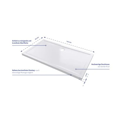 Im zeitlosen, puristischen Design ist die Duschtasse aus Acryl der Serie Pure perfekt abgestimmt auf die moderne, individuelle Badgestaltung. Sie bietet hohe Flexibilität bei Planung und Einbau – so bleiben keine Wünsche offen. Mit einem Maß von 140 x 90 cm und dank einer Tiefe von nur 4 cm ermöglicht sie einen barrierefreien Einstieg. Die Duschwanne Pure zeichnet sich durch ihr elegantes Design aus und ist aus extra widerstandsfähigem Acryl gefertigt. Ihr leichtes Gewicht und das schlanke Profil ermöglichen eine leichte Handhabung und Montage. Die Duschtasse lässt sich einfach reinigen und ist kratzfest. Es wird kein weiteres Montagezubehör mitgeliefert.