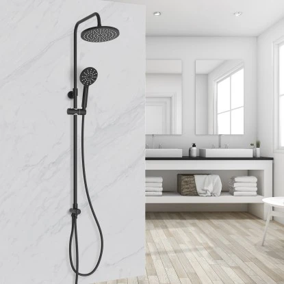Das Aurlane Hand- und Kopfbrause-Set Black Moments ist mit einer höhenverstellbaren Brausestange (Länge 72,5 cm) ausgestattet. Eine Kopfbrause und eine Handbrause mit 3 Strahlarten runden das System ab. Per Knopfdruck lässt sich leicht zwischen Kopf- und Handbrause wechseln. Das System ist in elegantem Schwarz matt gehalten.