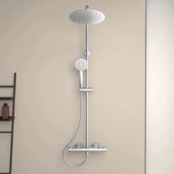 Die hohe Qualität der verwendeten Materialien macht Duschsystem robust und langlebig. Und weil du ein Bad willst, das lange hält, bestehen alle Teile aus verchromtem Metall. Um dir ein angenehmes und individuelles Abbrausen zu ermöglichen, ist die Handbrause mit einer Strahlart ausgestattet. Für eine tolle Regendusche hat die Überkopfbrause eine Größe von 20 cm x 20 cm (L x B). Dank Anti-Kalknoppen sind Überkopfbrause und Handbrause gegen unschöne Ablagerungen geschützt und lassen sich leicht reinigen. Damit du alle Körperstellen gut erreichst, besitzt der Brauseschlauch eine Länge von 150 cm. Durch den genormten Anschluss von 18,6 mm (G1/2) können Anschlussschlauch und Handbrause einfach befestigt werden. Das Duschbrause-Set wird mit seinem 100 cm langen Steigrohr an der Wand montiert. Damit du direkt mit der Montage beginnen kannst, legen wir dir das Befestigungsmaterial dazu.