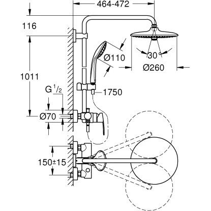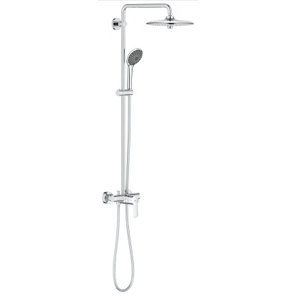 Das Grohe QuickFix Vitalio Joy 260 Duschsystem mit Einhand-Armatur und Umstellung bringt Designerstil und Duschgenuss in jedes moderne Badezimmer. Die 260 mm große Kopfbrause besitzt drei unterschiedliche Strahlzonen.