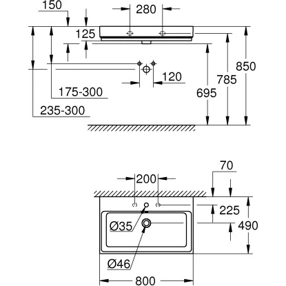 Für die Armatur ist bereits ein mittiges Hahnloch mit Ø 3,5 cm durchgestochen, zwei weitere sind vorgestochen und ermöglichen die Verwendung von Dreiloch-Armaturen. Ebenso vorbereitet ist der Ablauf mit Ø 4,6 cm. Die Montage fällt dementsprechend werkzeugarm aus.