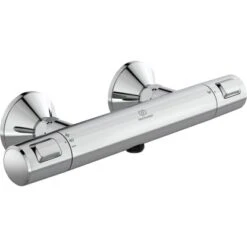Das Ideal Standard Brausethermostat Ceratherm T25 überzeugt durch wegweisende Technologie in Verbindung mit einem besonders schlanken Armaturenkörper. Die von Grund auf neu entwickelte FirmaFlow-Thermostatkartusche bietet kurze Reaktionszeiten und sichere Performance. Dank ihres kompakten Aufbaus verfügen alle CeraTherm T Thermostate über die Cool Body Technologie, die ein Aufheizen des Thermostatkörpers unterbindet. Die separat erhältliche Ablage zum Aufklipsen sorgt für zusätzlichen Stauraum. Besonders elegant sind auch die neuen CeraTherm T Duschsysteme aus dem Idealrain Programm. Das Brausethermostat verfügt über einen Rück?ussverhinderer und ist DVGW-Eigensicher. Die RV Patrone auf der Warmwasserseite mit integriertem Überdruckventil dient zur Druckentlastung.