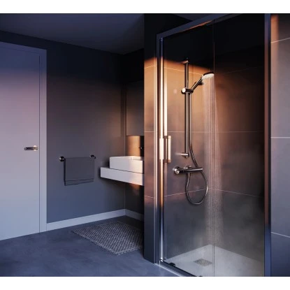 Die Ideal Standard Duschsystem Ceratherm T50 überzeugt durch wegweisende Technologie in Verbindung mit einem besonders schlanken Armaturenkörper. Die von Grund auf neu entwickelte FirmaFlow-Thermostatkartusche bietet kurze Reaktionszeiten und sichere Performance. Dank ihres kompakten Aufbaus verfügen alle CeraTherm T Thermostate über die Cool Body Technologie, die ein Aufheizen des Thermostatkörpers unterbindet. Die separat erhältliche Ablage zum Aufklipsen sorgt für zusätzlichen Stauraum. Der enthaltene Duschkopf besteht aus Metall und verfügt über einen schwenkbarem Druckknopfschieber. Die Brausestange hat eine Länge von 900 mm. Die Evo Handbrause mit 110 mm Durchmesser verfügt über eine Navigo-Druckknopfumschaltung. Wählen Sie zwischen den Strahlarten Regen, Massagestrahl und sanfter Regen. Die RV Patrone auf der Warmwasserseite mit integriertem Überdruckventil dient zur Druckentlastung Wassermengenregulierung mit 2-Wege-Ventil und ECO-Spartaste und keramischen Dichtscheiben