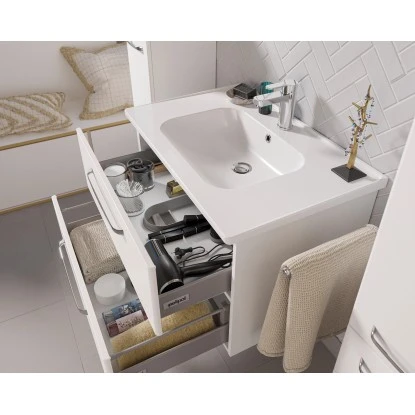 Als wandelbarer Allrounder und im kubischen Stil gestaltet, ist diese Badmöbelserie ein wahrer Bestseller. Die klare Formensprache bestimmt das zeitgemäße Design des Kundenlieblings. Das pflegeleichte Keramikwaschbecken mit seiner geradlinigen Form passt perfekt zum Waschbeckenunterschrank. Trentino passt sich jedem Ambiente mühelos an.
