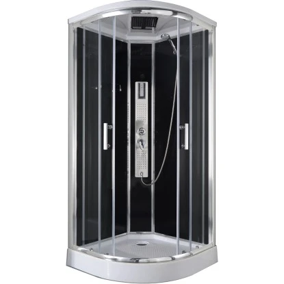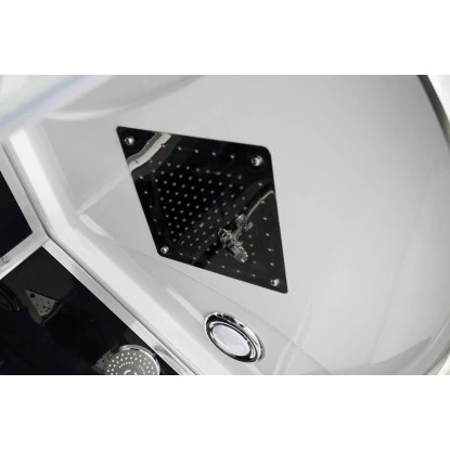 Ebenso sorgt die Runddusche mit ihrer Edelstahl-Überkopfbrause, ihrer verstellbaren Handbrause sowie ihren großflächigen Massagedüsen für erholsame Entspannungsmomente. Ihr Design überzeugt durch eine 4 mm schwarze Rückwand, elegante Chromprofile, eine getönte Tür, ein getöntes Glasfixteil, eine Glasablage, Doppelrollen und durch ein schwarzes Glaspaneel mit integrierten Massagedüsen. Ebenso verfügt Sie über einen Einhebelmischer mit Umsteller und einem Touchscreen-Bedienelement.