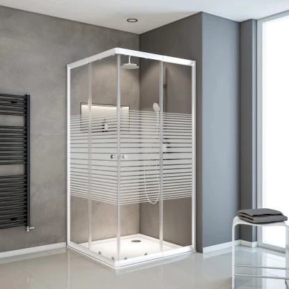 Der Schulte Eckeinsteig Sunny ist eine moderne Eckdusche mit Schiebetüren. Mit großen Elementen aus Einscheibensicherheitsglas und weißen Aluminiumprofilen gestalten Sie Ihr Bad modern und zeitgemäß. Dank der Schiebetüren öffnen Sie die Duschkabine besonders platzsparend.
