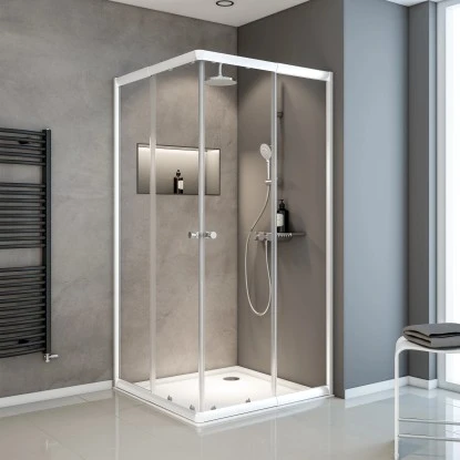 Unser vierteiliger Eckeinstieg mit Schiebetüren der Serie Sunny begeistert auf den ersten Blick mit großen Elementen aus Einscheibensicherheitsglas (ESG). Das nach DIN Norm gefertigte Glas zeichnet sich insbesondere durch seine gute Stabilität aus, dank welcher es auch Belastungen durch Schläge, Stöße, Biegungen sowie Temperaturschwankungen problemlos standhält.Außerdem überzeugt die Duschabtrennung mit dominanten Aluminiumprofilen in Silberfarben, welche eine zuverlässige Dichtigkeit sowie ein ruhiges Laufverhalten gewährleisten.Der vierteilige Eckeinstieg mit Schiebetüren punktet darüber hinaus mit seiner Flexibilität: Je nach Einbausituation haben Sie die Möglichkeit, die Profile individuell anzupassen. Ziehen Sie hierfür einfach die Aluminiumprofile ein Stück weit auseinander, bzw. schieben Sie sie zusammen.