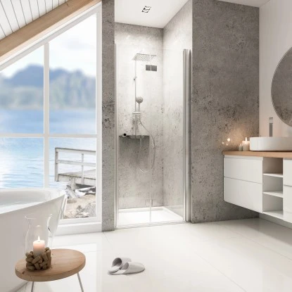 Die Drehfalttür der Serie Garant ist eine platzsparende und zugleich optisch ansprechende Lösung für kleine Bäder: Die formschöne, nach innen öffnende Drehfalttür bildet im geöffneten Zustand einen geräumigen Einstieg, der Ihr Bad zu keiner Zeit räumlich einschränkt.