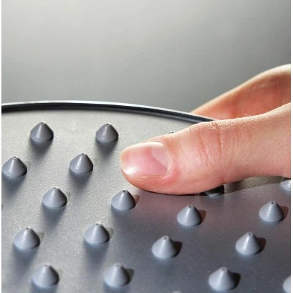 Die runde Kopfbrause hat einen Durchmesser von 25 cm. Die flexiblen Gumminoppen erleichtern das Entfernen von Kalkrückständen.