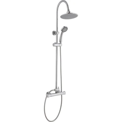 Das 4-teilige Überkopfbrauseset passt durch seine schlichte Optik in jede Badezimmereinrichtung. Es besteht aus einem Steigrohr (Ø 2,2 cm x 95 cm), einem Brauseschlauch, einer Überkopfbrause mit einem Ø von 18,5 cm, einer Handbrause, einer Thermostatarmatur sowie einem Umsteller. Das Set ist aus verchromtem Metall hergestellt und durch das Steigrohr höhenverstellbar. Die Handbrause verfügt über drei verschiedene Strahlarten. Der Brauseschlauch mit einer Länge von 150 cm besteht außen aus Edelstahl und innen aus Kunststoff. Außerdem ist er für Anschlüsse mit 24,1 mm (G 3/4) geeignet. Im Lieferumfang enthalten ist zudem das benötigte Befestigungsmaterial.